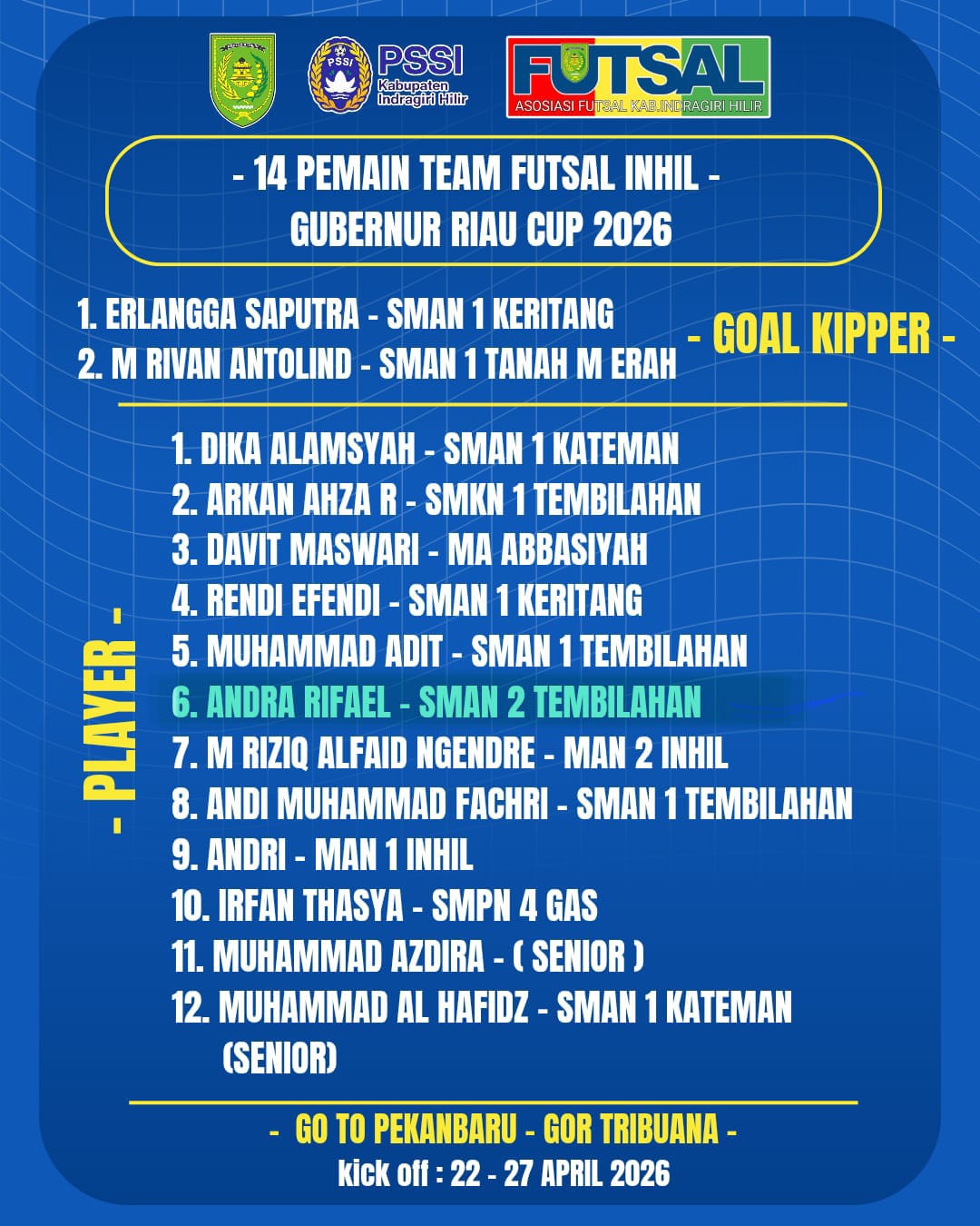 Tim futsal Inhil terdiri dari pemain-pemain pilihan yang berasal dari berbagai sekolah di wilayah Indragiri Hilir, baik SMA, SMK, hingga MA. Dari total 14 pemain yang terpilih, Andra Rifael menjadi salah satu perwakilan dari SMAN 2 Tembilahan yang dipercaya memperkuat tim.